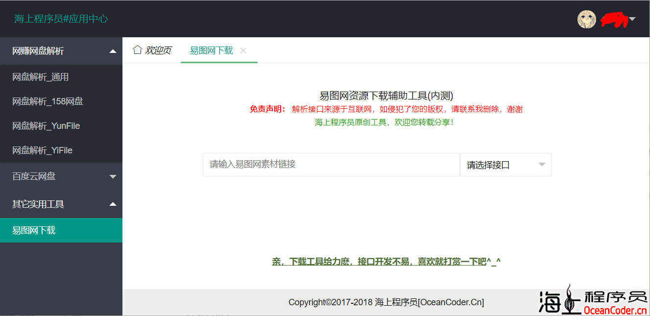 易图网[yipic.cn]素材资源下载工具(声明: 解析接口无破解功能,由站长购买帐号代下)本软件收费,为避免封号,每人每日可下载8个资源,别人已下载的资源不统计次数,有意购买请联系站长欢迎登录本站应用中心体验 http://app.oceancoder.cn...